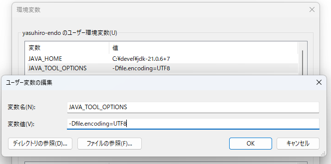 そこで以下のような環境変数を設定してJDKの文字コードをUTF-8にします。