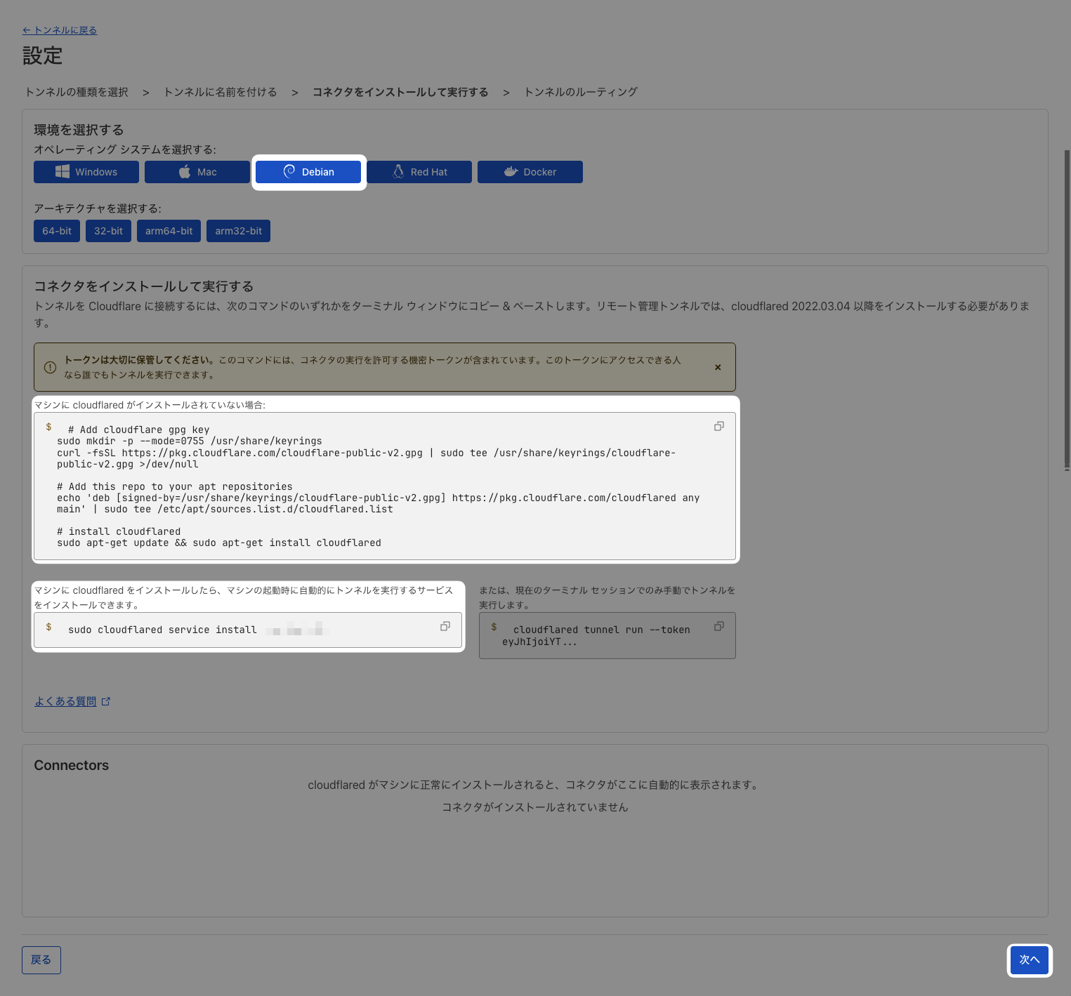 #1.1 Cloudflare Tunnel の作成でコピーしたインストールコマンドを実行します。