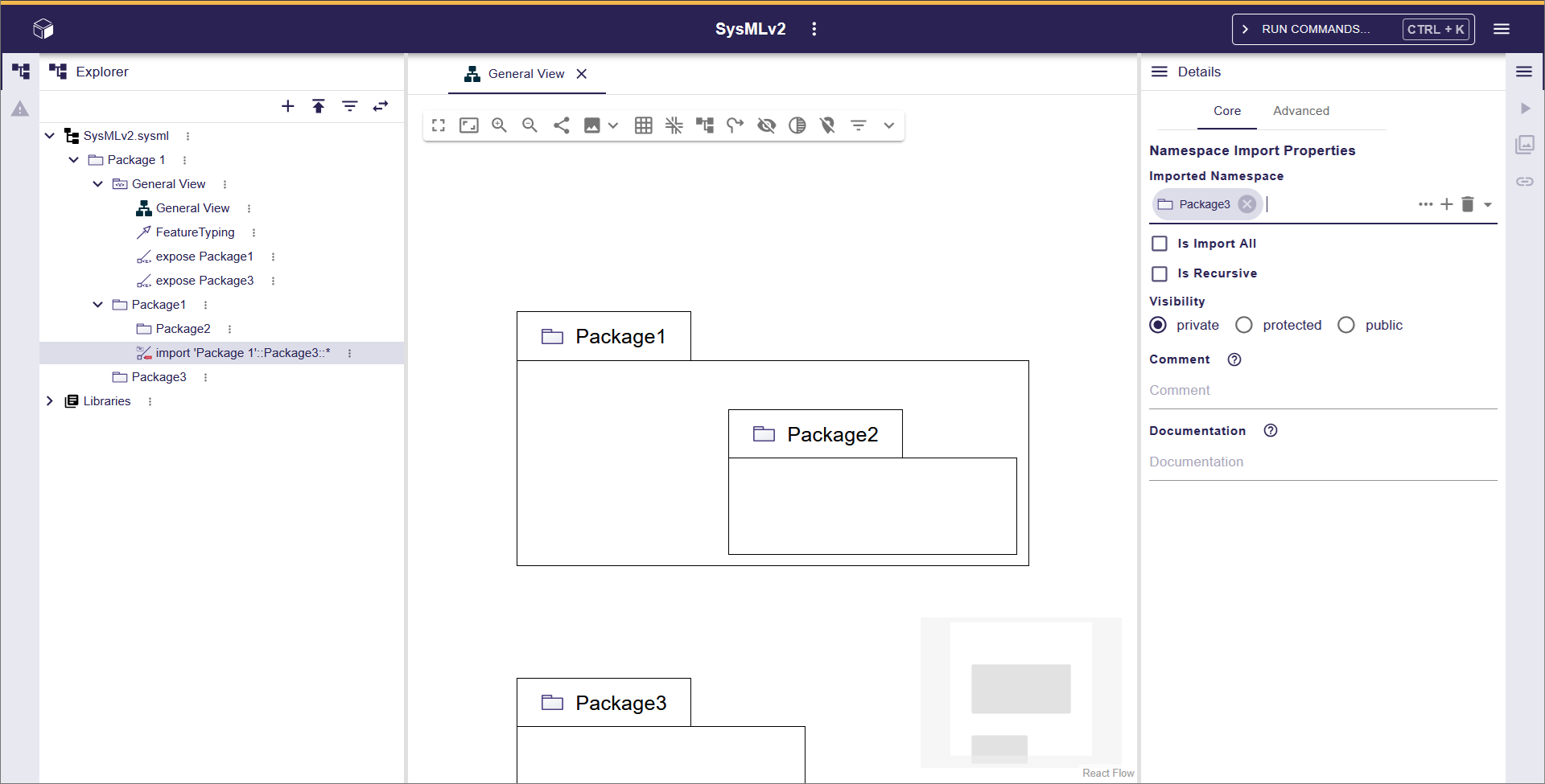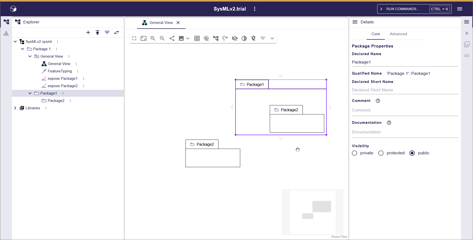 このとき、左サイドバーのツリーをみると、新しく追加した"Package1"は"General View"がある"Package1"の中に追加されていることがわかります。