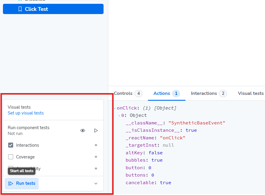 すべてのインタラクションテストは Storybook の UI 上から一括実行が可能です。