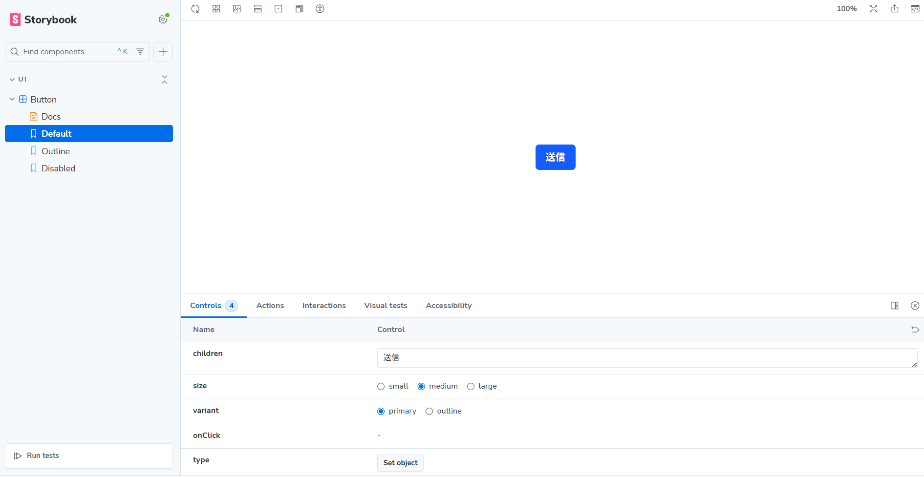 Storybook ではさらに、クリック時の挙動などユーザーインタラクションを含む「ふるまい」のテストが行えます。