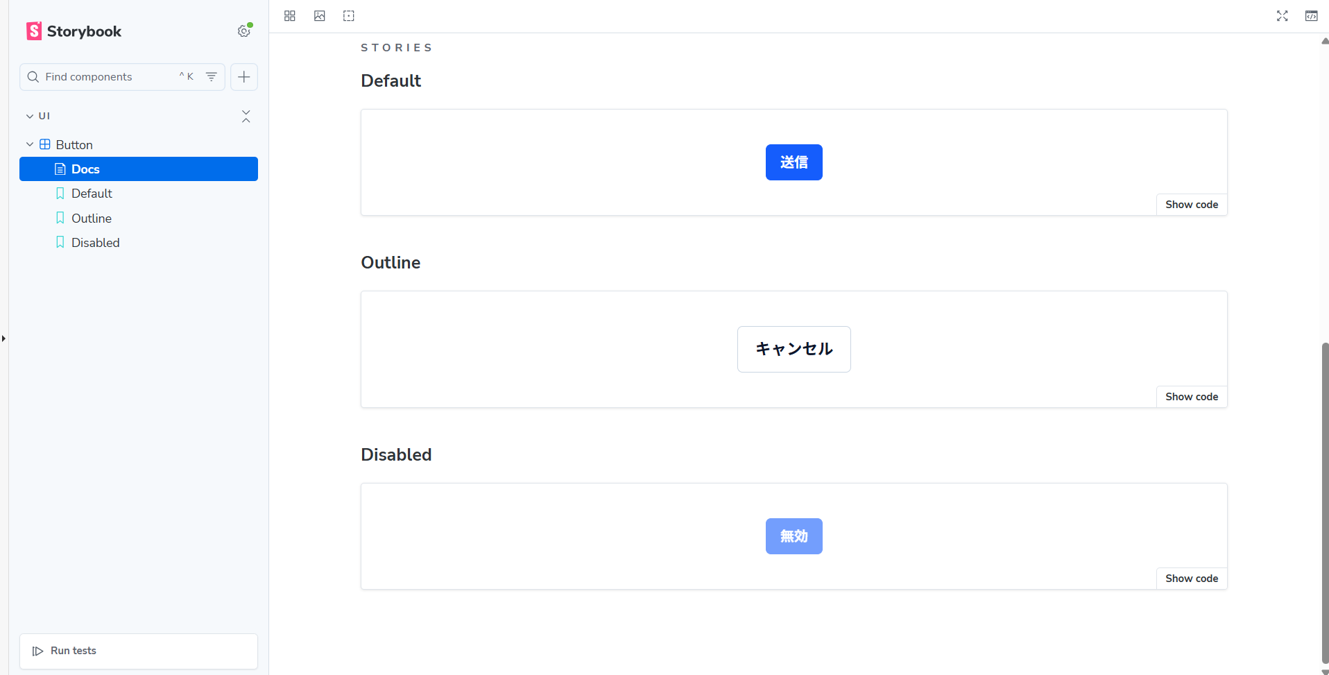 コンポーネントをアプリ本体から切り離して単体で描画でき、Props や状態のパターンを「ストーリー」として整理ができます。
